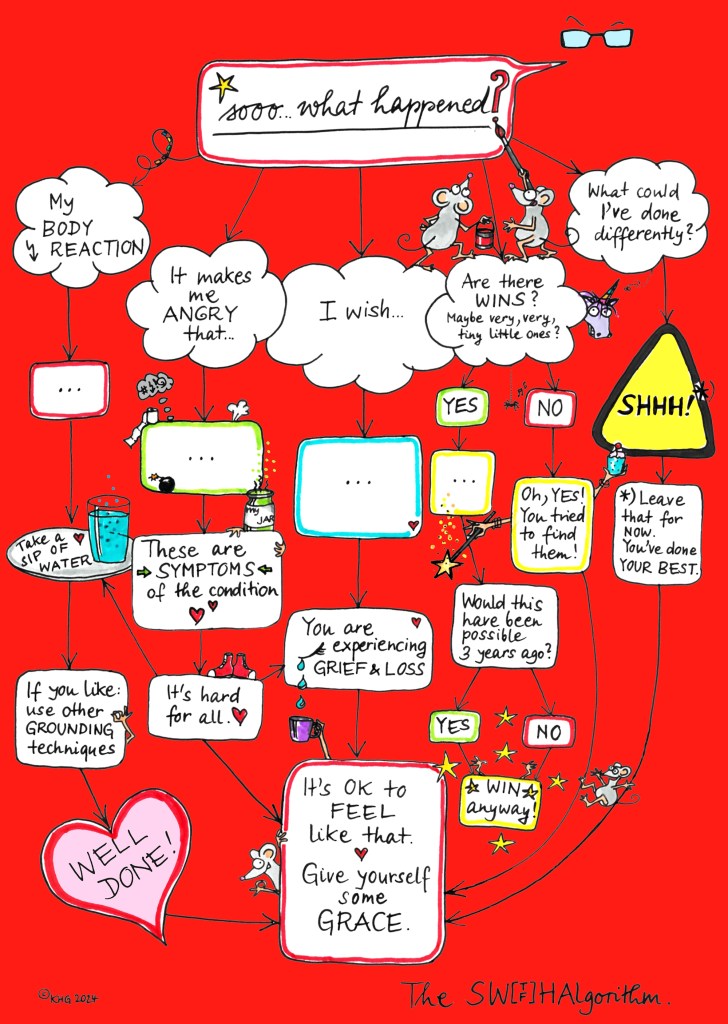 First the Sooo What Happened Algorithm. Choose any difficult situation you have recently experienced in your daily life and work your way through the algorithm. (Read more here.)