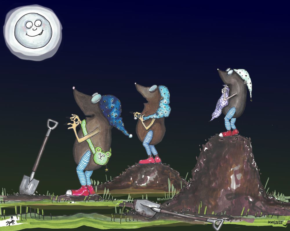 Night moles are moon lovers. One night the three night moles were admiring the full moon. Each of them stood on his own molehill. They were all the same size. Unfortunately, the big mole blocked the little one’s view. So they had to come up with a solution so that the smallest one could also have a good view. They had to come up with a fair solution.