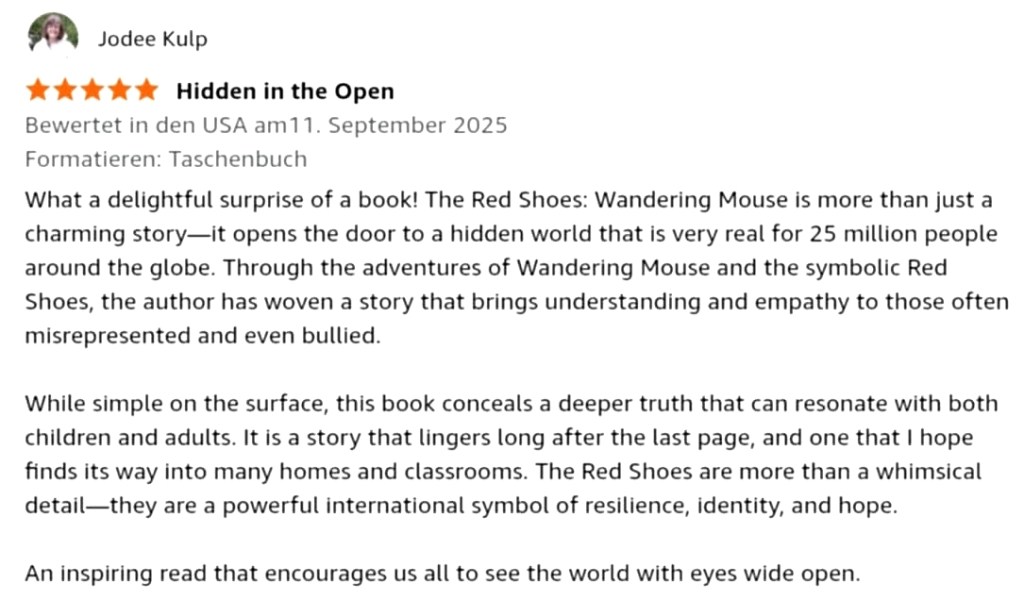 Visit my author’s page on Amazon for the paperback edition and on Lulu for the hardback edition. – Die roten Schuhe der Wandermaus auf Deutsch gibt es hier.