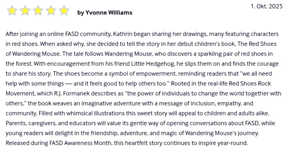 Inspiriert ist diese Geschichte von RJ Formanek, dem Mitbegründer der Red Shoes Rock Kampagne. Rote Schuhe sind ein internationales Symbol für FASD Awareness.